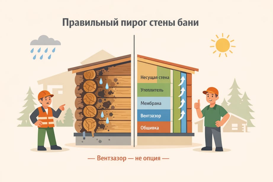 Баня — уникальная постройка. Внутри парной может быть +90°C и влажность 80%, снаружи зимой — минус 25°C. Ни один другой объект на участке не испытывает таких перепадов. Из-за этого через стены постоянно движется пар — изнутри наружу. И если снаружи его не выпустить правильно, он конденсируется прямо в толще стены, превращая бревно или блок в губку.
